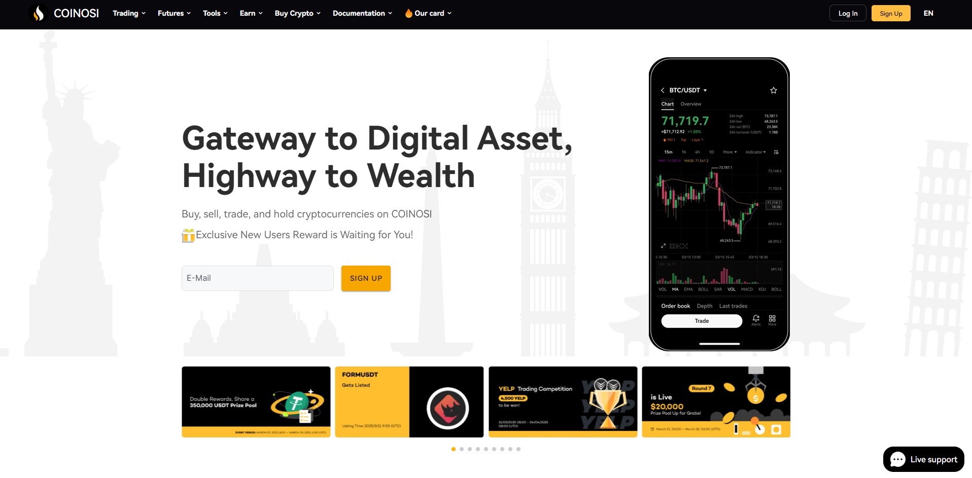 COINOSI, появившаяся в 2022 году, представляет собой некастодиальную анонимную платформу для обмена криптовалют. Основные акценты сделаны на приватность и скорость работы, при этом KYC не требуется.