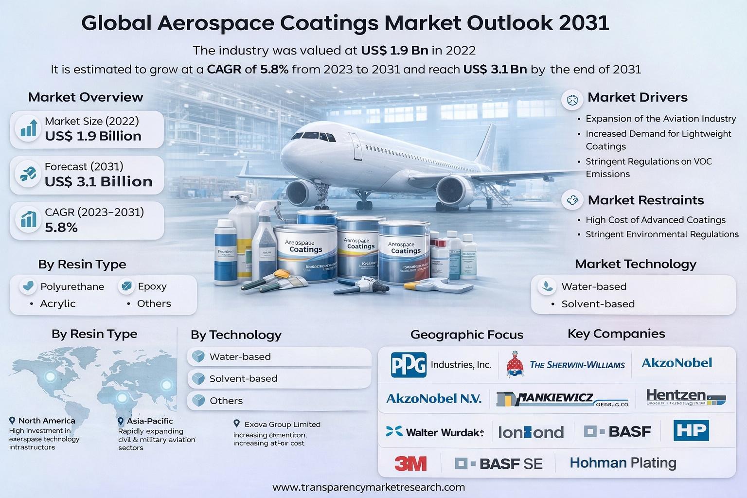 The global aerospace coatings market is witnessing steady growth as aviation and space industries continue to expand worldwide. Valued at US$ 1.9 billion in 2022, the market is projected to reach US$ 3.1 billion by the end of 2031, growing at a CAGR of 5.8% from 2023 to 2031. This growth trajectory highlights the critical role aerospace coatings play in enhancing aircraft performance, safety, and durability amid rising air traffic and rapid technological advancement.