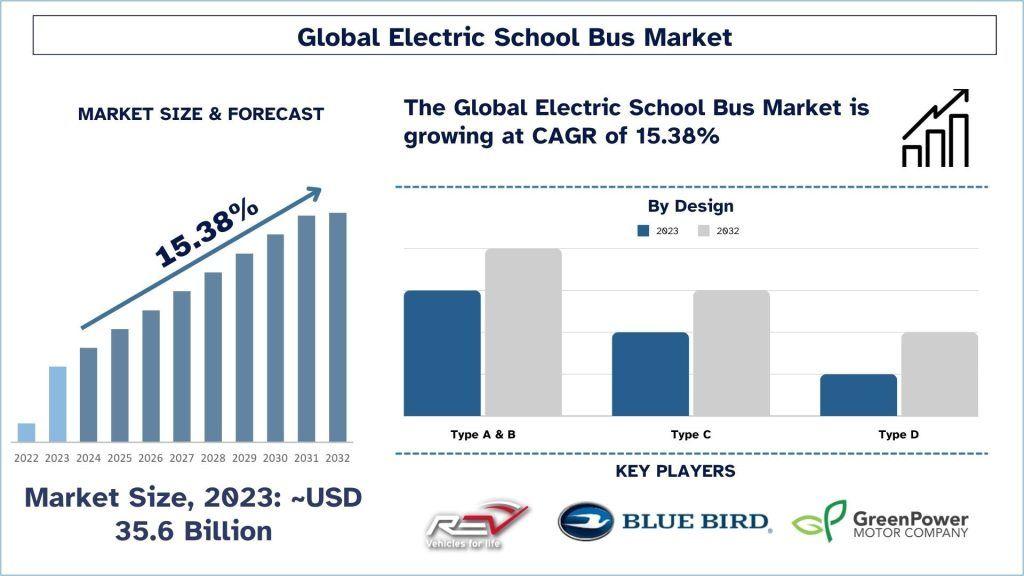 The Electric School Bus Market was valued at USD 35.6 billion in 2023 and is projected to expand at a CAGR of 15.38% between 2024 and 2032, reaching USD billion by 2032, reflecting accelerating adoption worldwide.