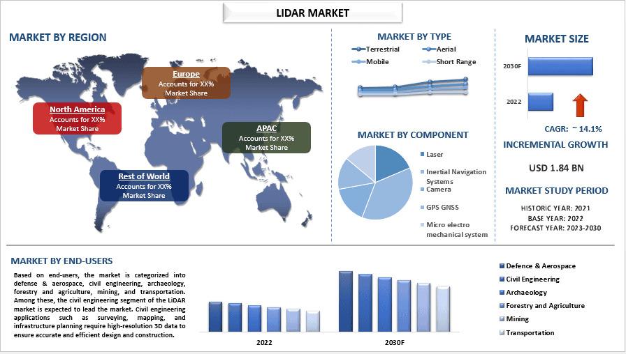 According to the UnivDatos LiDAR Market” report, the global LiDAR market was valued at USD 1.84 billion in 2022 and is projected to expand at a CAGR of 14.1% from 2023 to 2030, reaching USD billion by 2030.