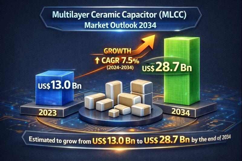 The global Multilayer Ceramic Capacitor (MLCC) market is witnessing robust growth as electronic devices become smaller, smarter, and more powerful. Valued at US$ 13.0 billion in 2023, the market is projected to expand at a CAGR of 7.5% from 2024 to 2034, reaching an estimated US$ 28.7 billion by the end of 2034. This strong trajectory highlights the indispensable role MLCCs play across consumer electronics, automotive systems, telecommunications, and emerging energy technologies.