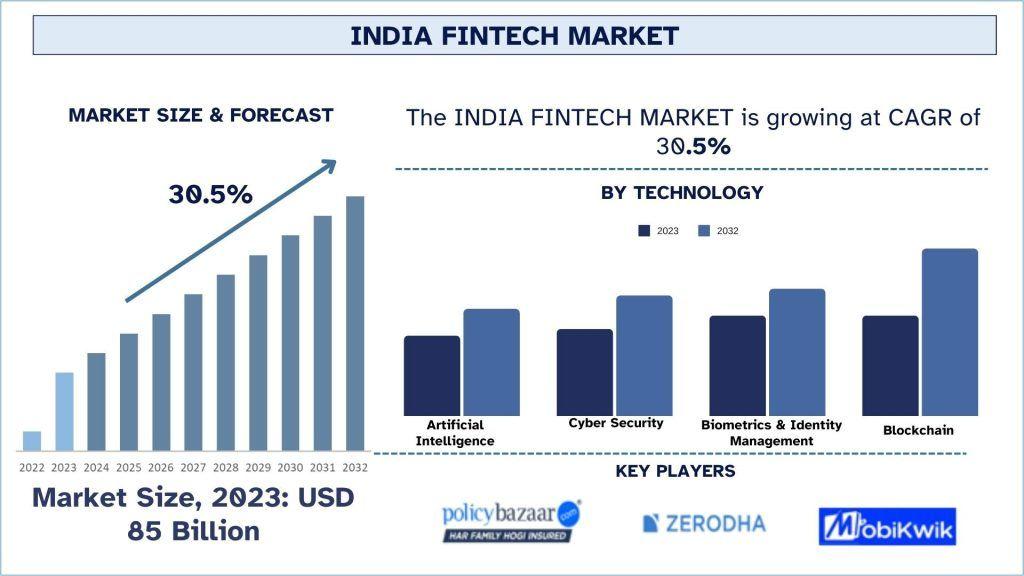 According to UnivDatos, increasing infrastructure development and strong government initiatives are expected to drive the global fintech market landscape. As per the India Fintech Market report, the market was valued at USD 85 billion in 2023 and is projected to grow at an impressive CAGR of 30.5% during the forecast period (2024–2032), reaching USD billion by 2032.